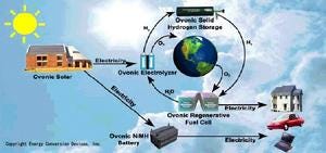 Joi Ito talks about the Hydrogen Economy: "The picture above is ECD's vision of the Hydrogen Economy. Get Carbon out of the picture. Reduce the cycle to the basic elements of the universe. Photons creating energy to break H2O into Hydrogen and Oxygen. Oxygen goes back to the atmosphere and the Hydrogen is stored and transported in the Hydride material. The Hydrogen is later extracted to create energy through combustion or through the creation of electrical energy with a fuel cell. This electricity can be stored in a Hydride battery which is also based on Hydrogen. The electricity obviously can be used for propulsion or be converted into meta-energy, or information. Photons->Hydrogen->Electrons->Bits thats all we need. No CO2, fossil fuels, Uranium or any of the non-big-bang stuff please. Oh and by the way, the basic material and the phenomenon used to store hydrogen in a solid, the convert hydrogen in to electricity and the store electricity in hydride batteries is the based on the same basic science."