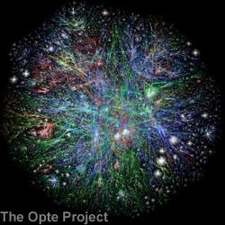 The Opte Project is mapping the Internet and creating visual maps. Here's one from last week. 5 million edges and has an estimated 50 million hop count. I'm not sure exactly what that means. They have a feature, turned off right now unfortunately, which would allow you to find your own IP address on the map. "You are HERE".