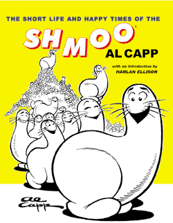 The Shmoo first appeared in the strip in August 1948. According to Shmoo legend, the lovable creature laid eggs, gave milk and died of sheer esctasy when looked at with hunger. The Shmoo loved to be eaten and tasted like any food desired. Anything that delighted people delighted a Shmoo. Fry a Shmoo and it came out chicken. Broil it and it came out steak. Shmoo eyes made terrific suspender buttons. The hide of the Shmoo if cut thin made fine leather and if cut thick made the best lumber. Shmoo whiskers made splendid toothpicks. The Shmoo satisfied all the world's wants. You could never run out of Shmoon (plural of Shmoo) because they multiplied at such an incredible rate. The Shmoo believed that the only way to happiness was to bring happiness to others. Li'l Abner discovered Shmoos when he ventured into the forbidden Valley of the Shmoon, against the frantic protestations of Ol' Man Mose. "Shmoos," he warned, "is the greatest menace to hoomanity th' world has evah known." "Thass becuz they is so bad, huh?" asked Li'l Abner. "No, stupid," answered Mose, hurling one of life's profoundest paradoxes at Li'l Abner. "It's because they're so good!"