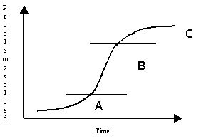 Paradigms usually don't start working well right away. And they don't suddenly just stop working either. One way of looking at the life cycle of a paradigm is with a diagram like this. There's a starting period, A, when the paradigm is still being developed, and one hasn't quite figured out the best way of using it yet, so it isn't all that impressive how well it solves problems. Then there's a phase B, where it all has been streamlined, and the paradigm accepted, and it solves lots of problems. Finally, phase C, it slows down, or might eventually drop. Maybe the problems get harder, or they change fundamentally. That's probably when somebody might start looking for better paradigms. Would be better if they did it in phase B, so that there would be time to develop the new approach. But most people wouldn't be looking at that time.