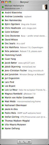 If you didn't know, Apple has this protocol called Bonjour, which used to be called Rendezvous. That was a better name, but somebody else sued them for the rights to it. Anyway, what it does is, quite automatically, to notice who's close by on the same local network. So, this is not this person's buddy list across the net. Here it is the people who're present in the same room. Which he might or might not know.