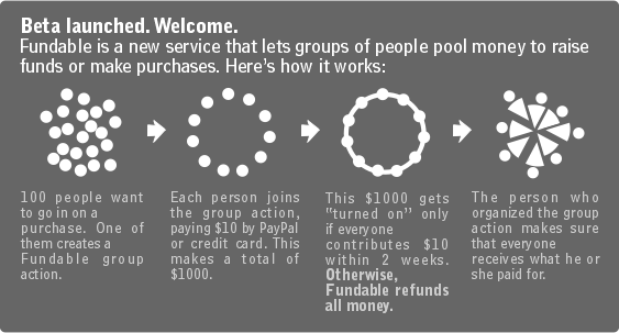 Seb mentions Fundable. Seems like a great way to raise funds for a particular purpose. Essentially it works like this: