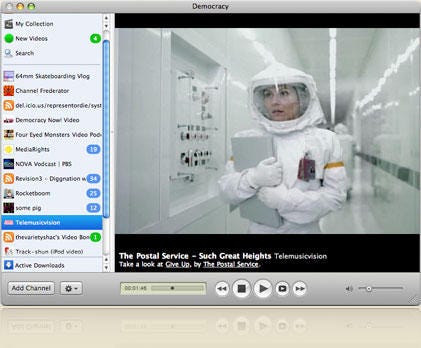 Wow, very cool! The Democracy Player from the Participatory Culture Foundation. It's a desktop application for watching free, open source TV. Kind of like iTunes, but for free stuff only. And better, really. Lots of channels, which essentially are PodCast channels. I.e. often amateurs that produce a weekly, daily, or occasional video show, which is freely available. Or some public broadcasting shows, and various other sources. All free, and all stuff that you wouldn't necessarily see on TV. Quality varies, but there's lots of choice.