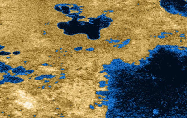 Pictures of methane lakes on Saturn's moon Titan here from NASA. Hm, I think I even see some Titanium cows walking around.
